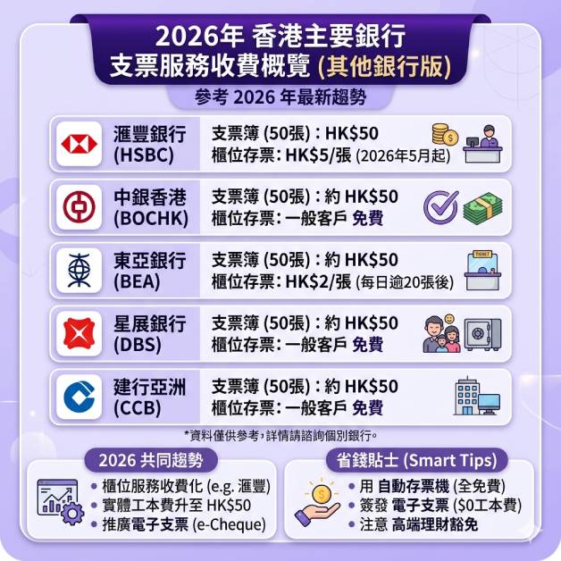 • 實體收費普調:由於營運成本上升,2026 年大部分銀行對實體支票簿的收費已統一至 HK$50 或以上。